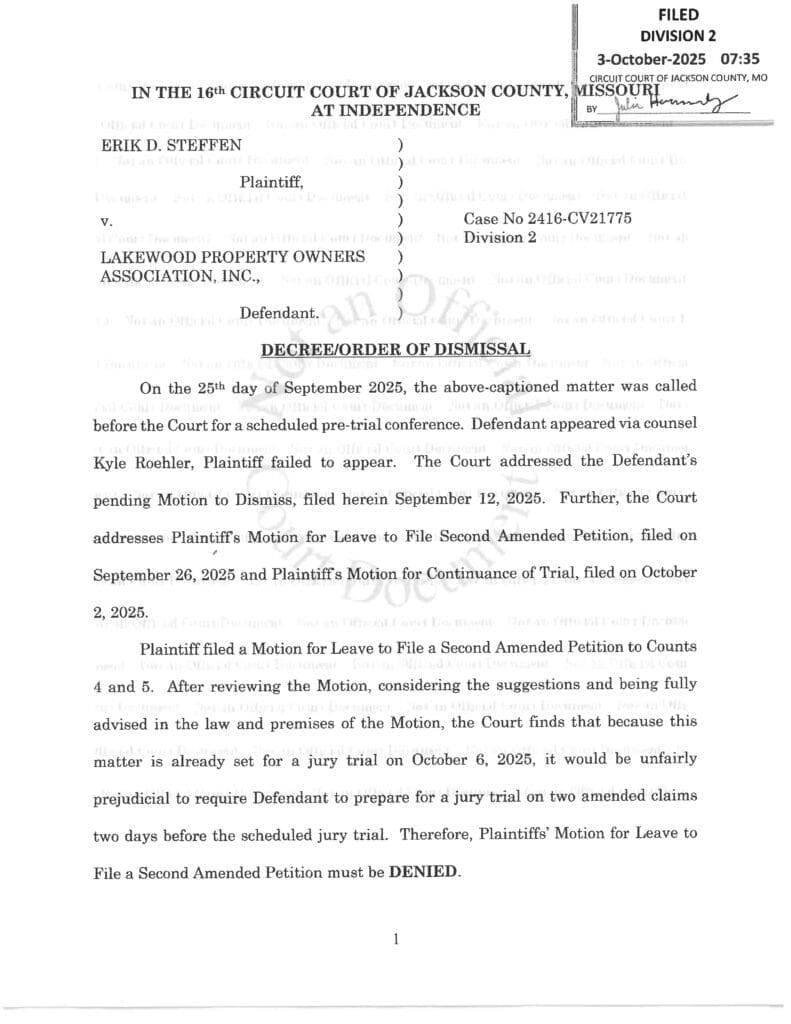 In the matter of CASE NO. 2416-CV21775 Steffen V LPOA, the court has dismissed this case on October 3, 2025 with prejudice. Please see the order posted herein—